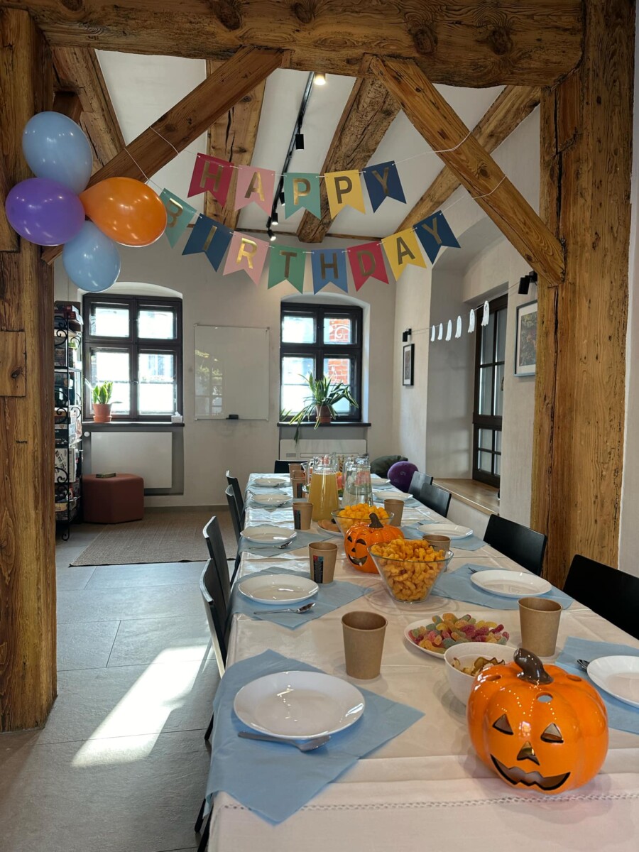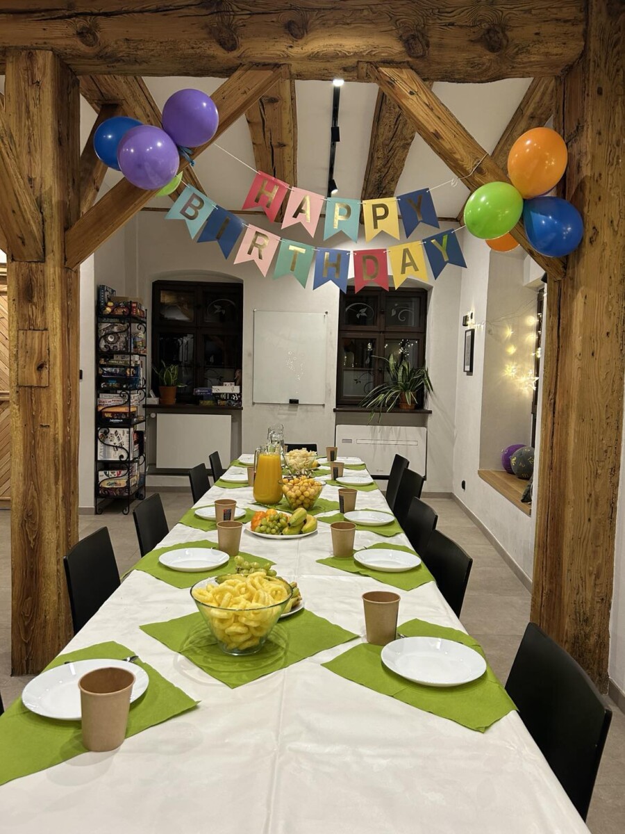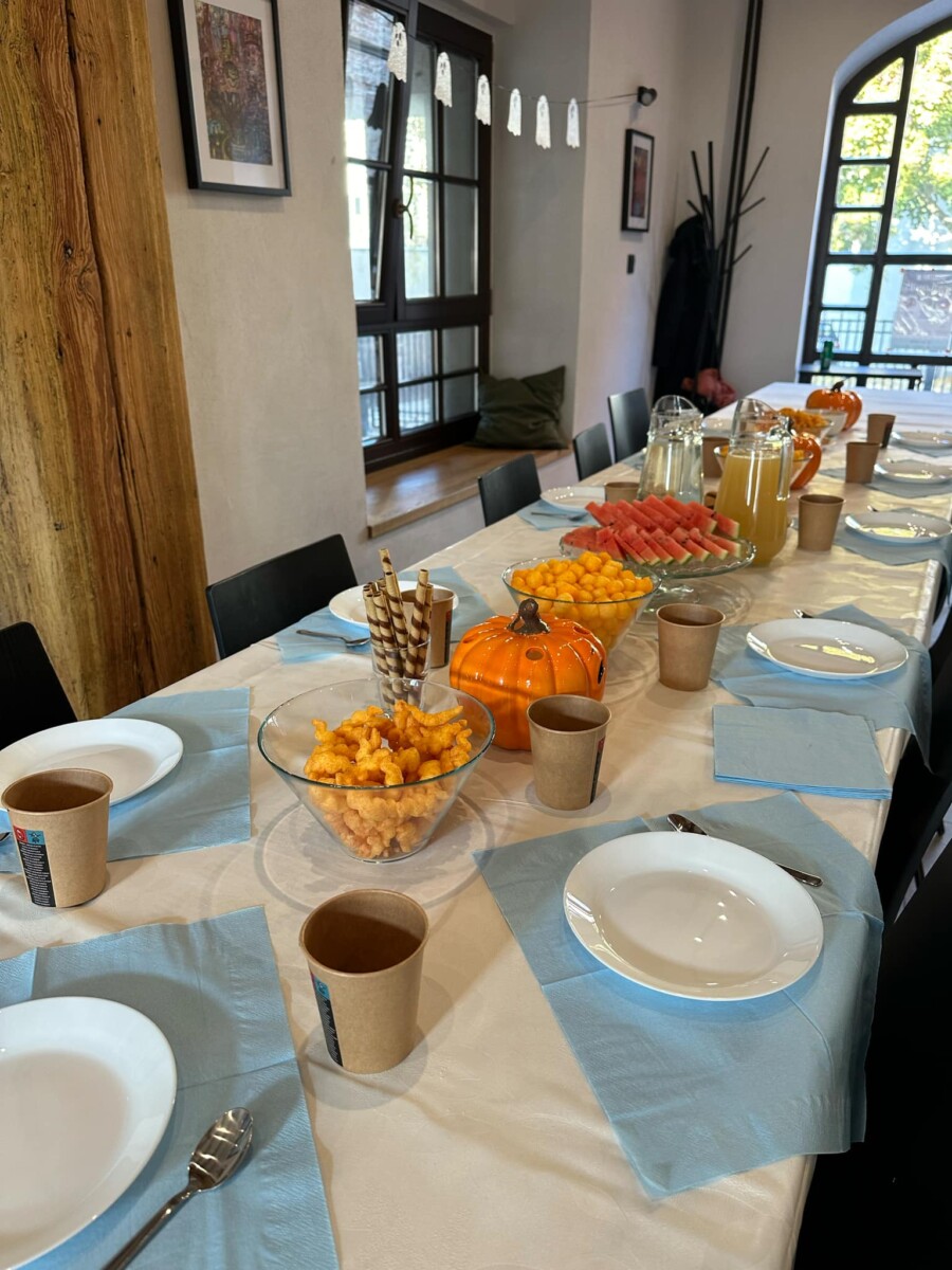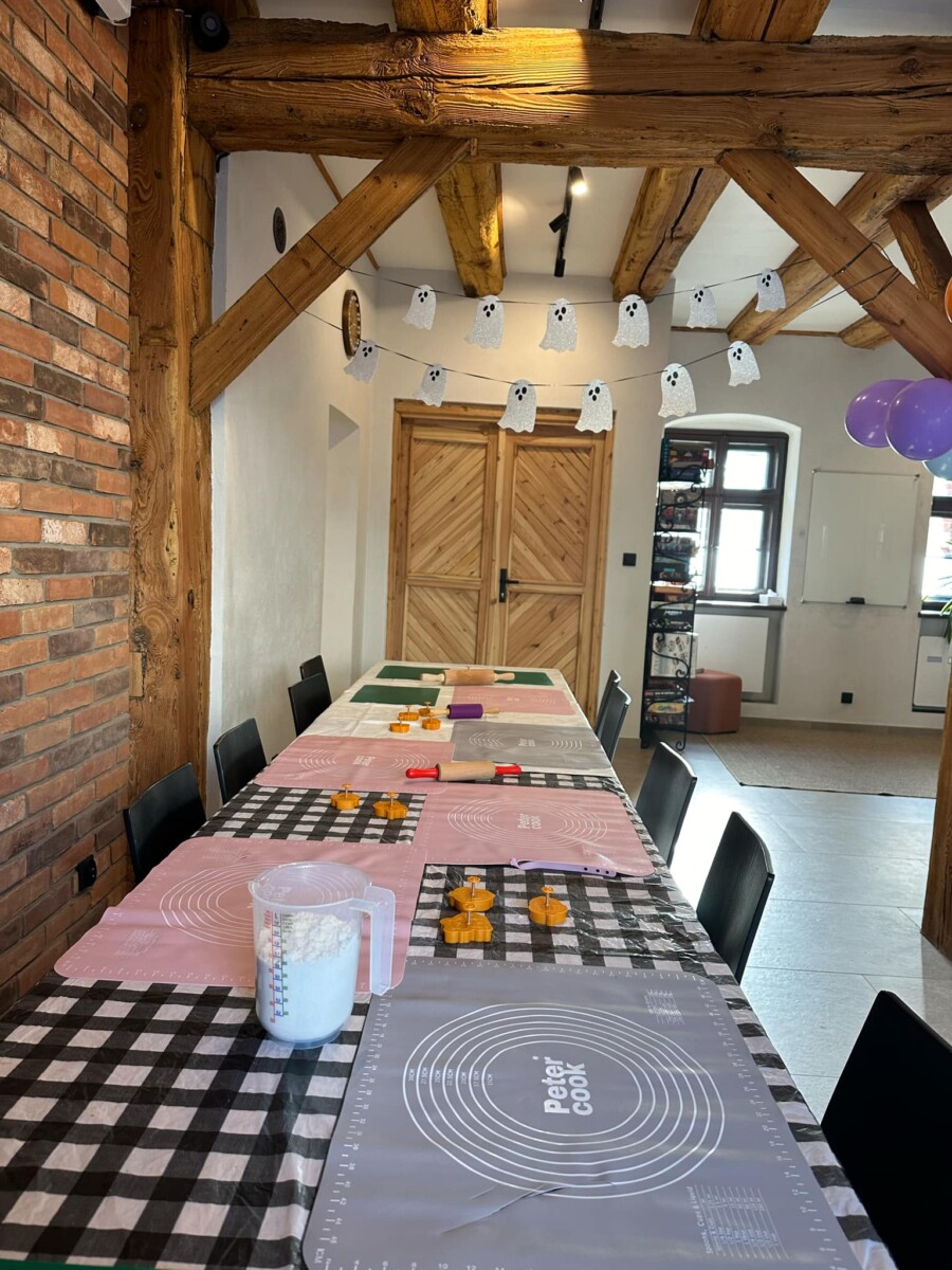 Na uczestników czekają soki, woda, słodki i owocowy poczęstunek, wszystkie niezbędne akcesoria do warsztatów i składniki do pieczenia oraz przystrojona sala.